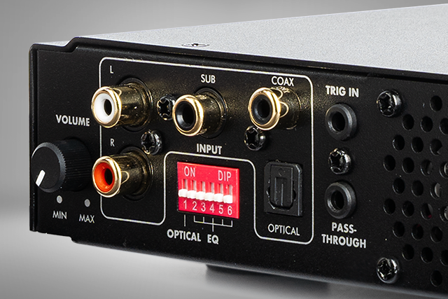 MP500 V2 has Stereo RCA as well as a selectable Digital Coax or Digital Optical input, offering plenty of flexibility to directly connect your favorite source for Stereo playback. The dedicated Subwoofer (LFE) input makes it incredibly easy to power a Custom Installation subwoofer, like our Dynamo IW-S or IW-O, by connecting directly to the “Subwoofer Output” of your AVR or other electronic device. For installation flexibility, MartinLogan Custom Installation subwoofer DSP presets include a Low-Pass Filter when using the Left/Right inputs, or no additional filtering when using the dedicated subwoofer input.