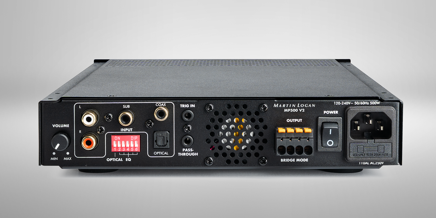 MP500 V2 has Stereo RCA as well as a selectable Digital Coax or Digital Optical input, offering plenty of flexibility to directly connect your favorite source for Stereo playback. The dedicated Subwoofer (LFE) input makes it incredibly easy to power a Custom Installation subwoofer, like our Dynamo IW-S or IW-O, by connecting directly to the “Subwoofer Output” of your AVR or other electronic device. For installation flexibility, MartinLogan Custom Installation subwoofer DSP presets include a Low-Pass Filter when using the Left/Right inputs, or no additional filtering when using the dedicated subwoofer input.